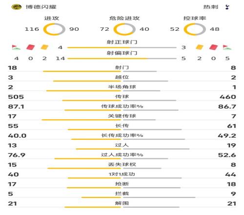 控球率方面,雙方呈現(xiàn)勢均力敵之勢,博德閃耀控球率52%,熱刺控球率48%。進(jìn)攻次數(shù)上,博德閃耀116次,熱刺90次。危險進(jìn)攻次數(shù)方面,博德閃耀72次,熱刺40次。