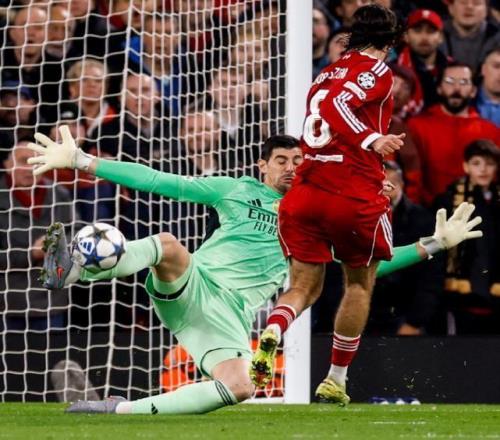 比賽從一開(kāi)始就進(jìn)入了利物浦熟悉的快節(jié)奏。上半場(chǎng),利物浦中場(chǎng)索博斯洛伊便成為皇馬防線的噩夢(mèng)。他先是機(jī)敏包抄搶點(diǎn),被庫(kù)爾圖瓦反應(yīng)神速用腳擋出;隨后又一腳勢(shì)大力沉的遠(yuǎn)射,再次被這位比利時(shí)門(mén)神飛身化解。整個(gè)上半場(chǎng),利物浦的進(jìn)攻一浪高過(guò)一浪,而站在他們面前的,仿佛是一堵無(wú)法逾越的高墻。