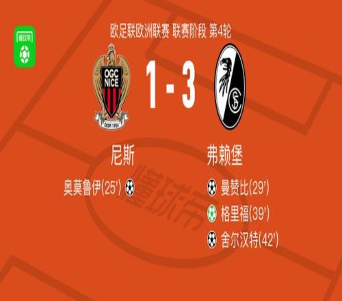 北京時間11月7日歐足聯(lián)歐洲聯(lián)賽 聯(lián)賽階段 第4輪,尼斯對陣弗賴堡。尼斯奧莫魯伊破門。弗賴堡曼贊比破門,舍爾漢特破門,格里福破門。最終比分尼斯 1-3 弗賴堡。