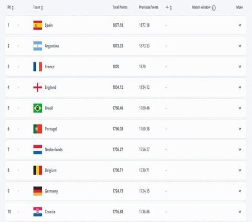 世界排名前十名分別是西班牙、阿根廷、法國、英格蘭、巴西、葡萄牙、荷蘭、比利時(shí)、德國與克羅地亞。
